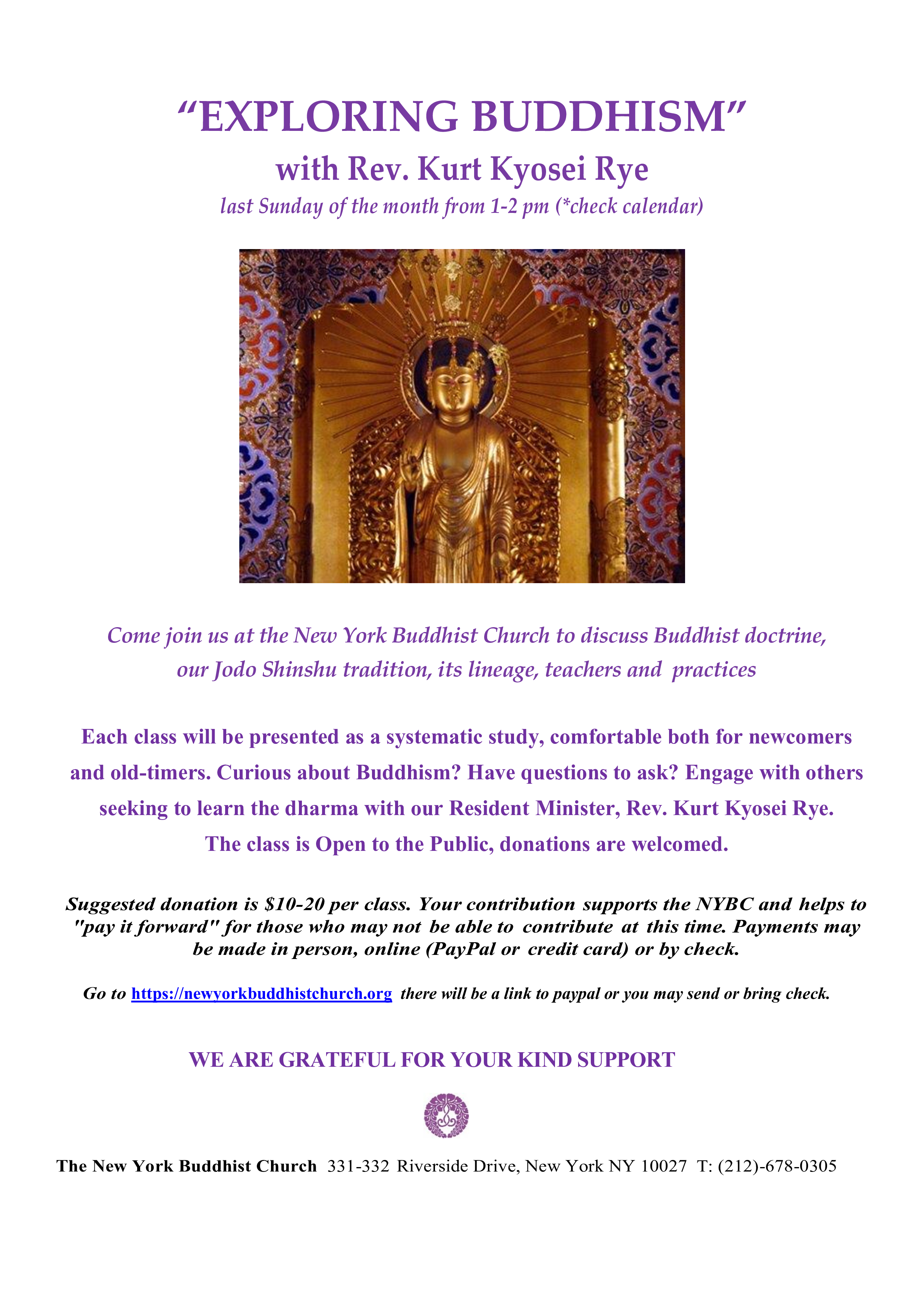 We welcome your dana (generosity) support for without it we cannot continue the services, classes and activities at the NYBC.