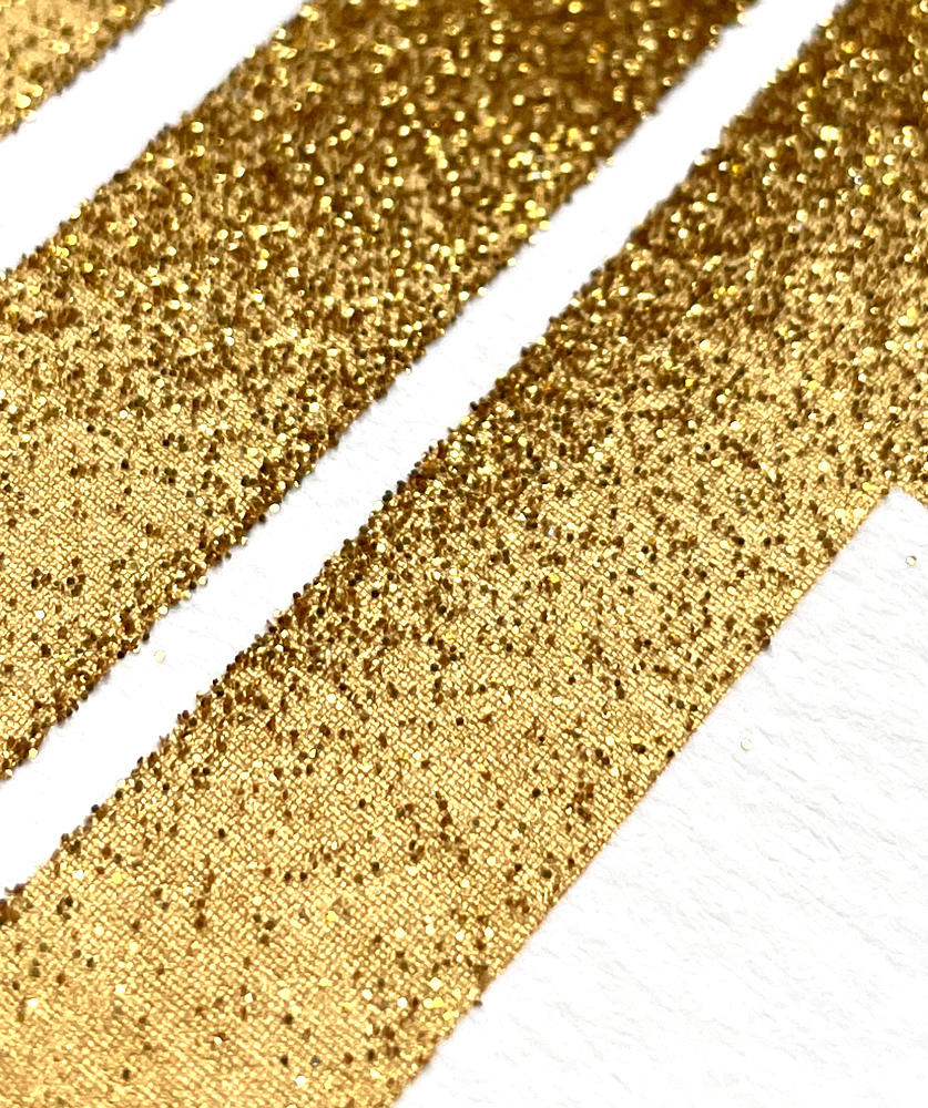Closeup of Namu Amida Butsu silkscreen with glitter